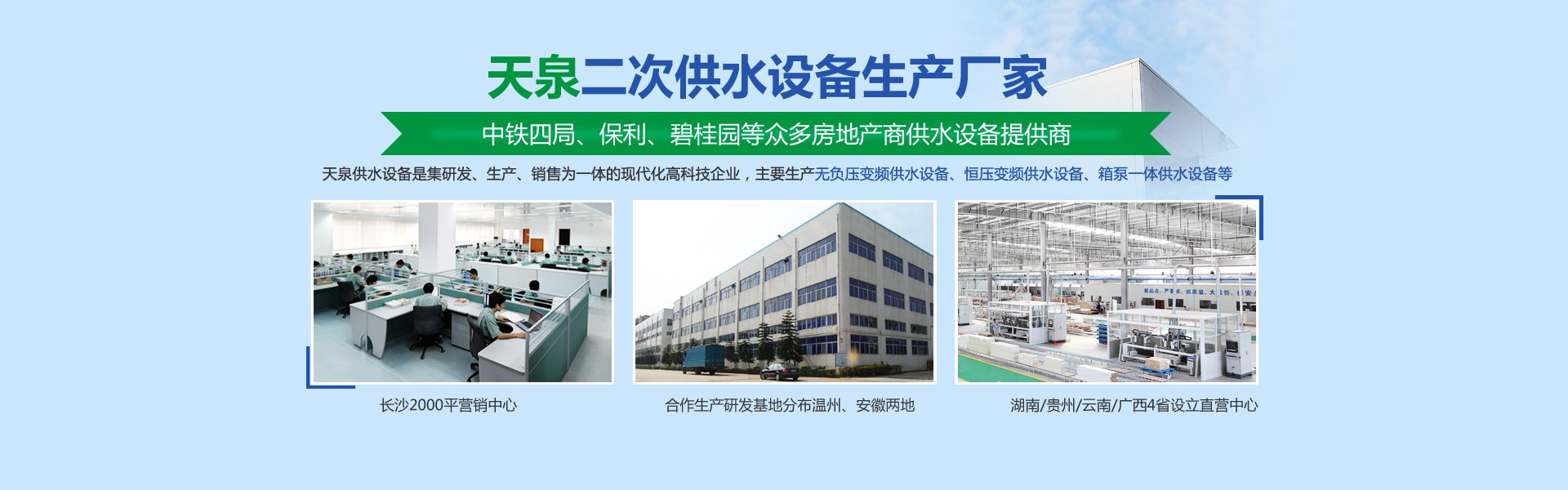 產品廣泛用于增壓、工業(yè)、生活供水、空調水循環(huán)、供暖、公共場所供水,園林灌溉、水廠水處理等諸多領域。天泉不僅是國內供水設備制造商,還是業(yè)內具有投標實力的品牌企業(yè)。在行業(yè)內取得ISO9001質量體系認證,獲得湖南省質量技術監(jiān)督局頒發(fā)的“質量檢測報告”,并且得到了湖南省衛(wèi)生廳認證的“湖南省衛(wèi)生安全飲用水衛(wèi)生許可批件”,多項計算機軟件著作權登記證書等。